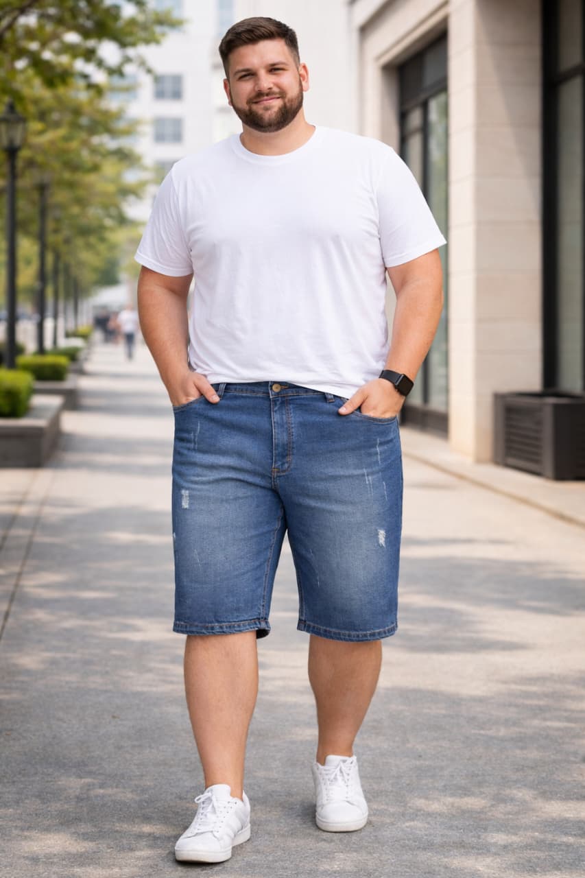 Bermuda jeans masculina Plus Size, ideal para quem busca conforto e caimento perfeito com tecido stretch que acompanha o movimento.